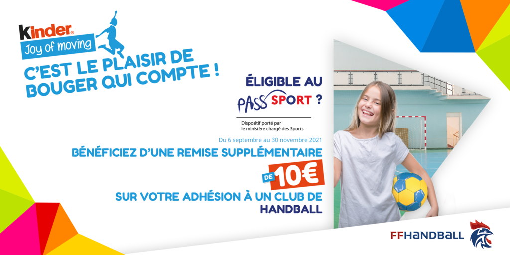 Pour la rentrée sportive, le partenaire de la FFHandball, Kinder Joy of moving offre 10€ de remises supplémentaires aux bénéficiaires du Pass'Sport, licenciés dans un club de handball.