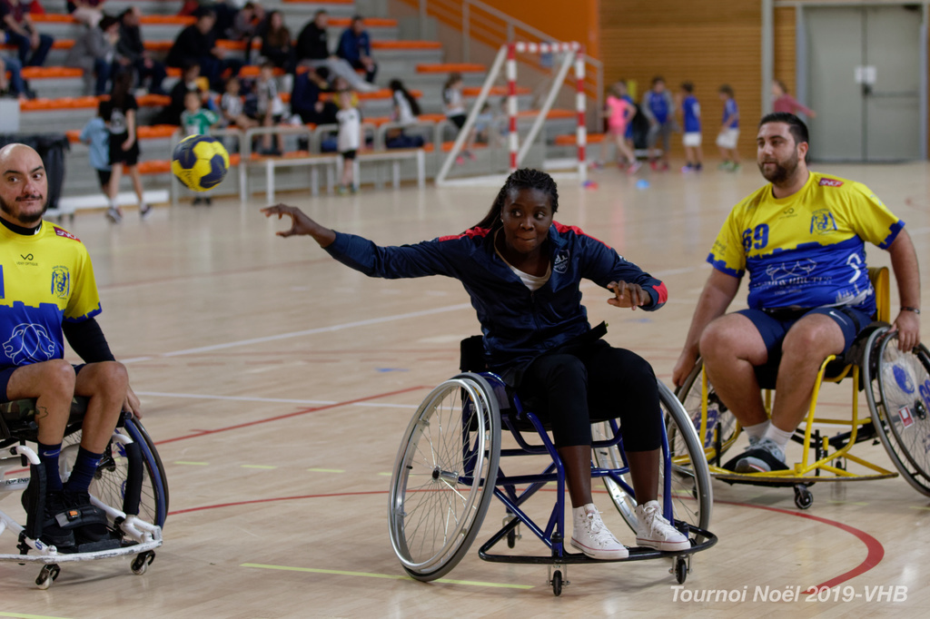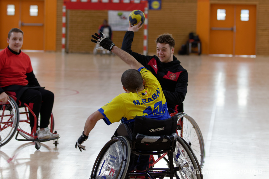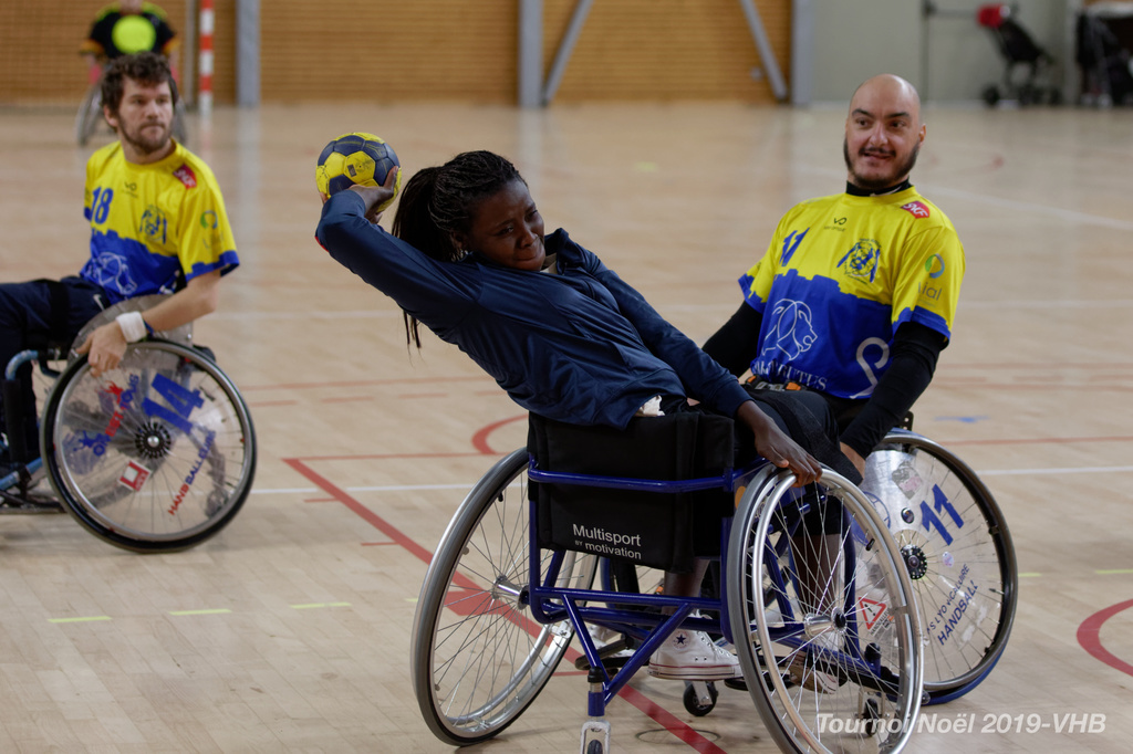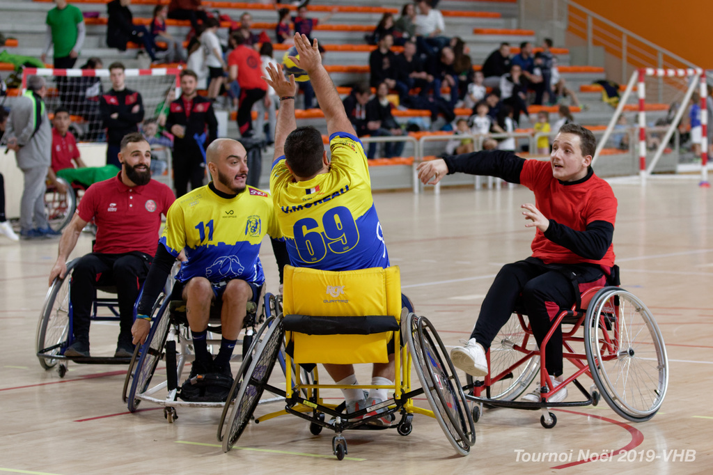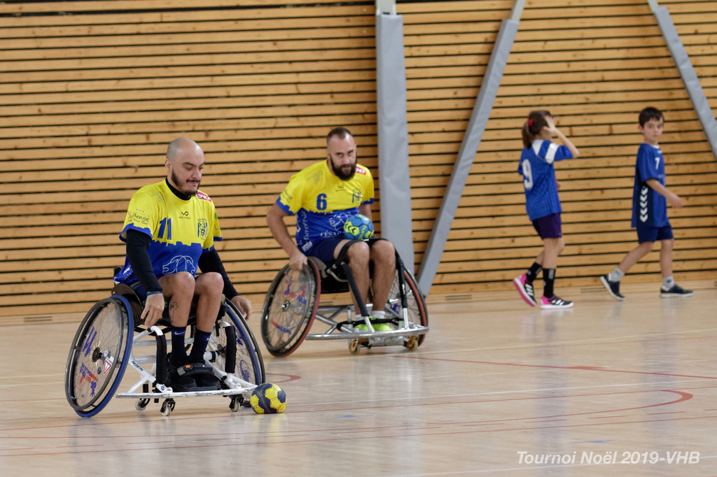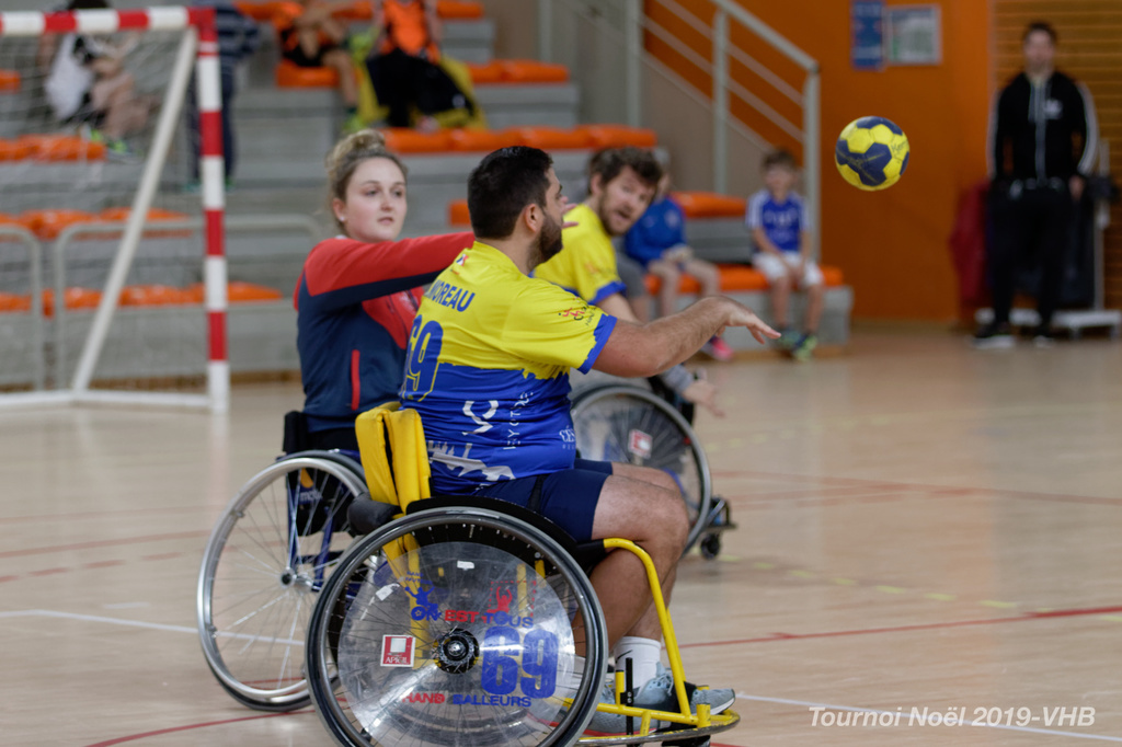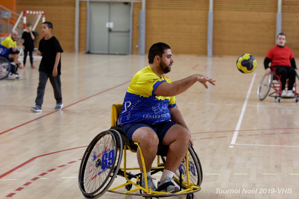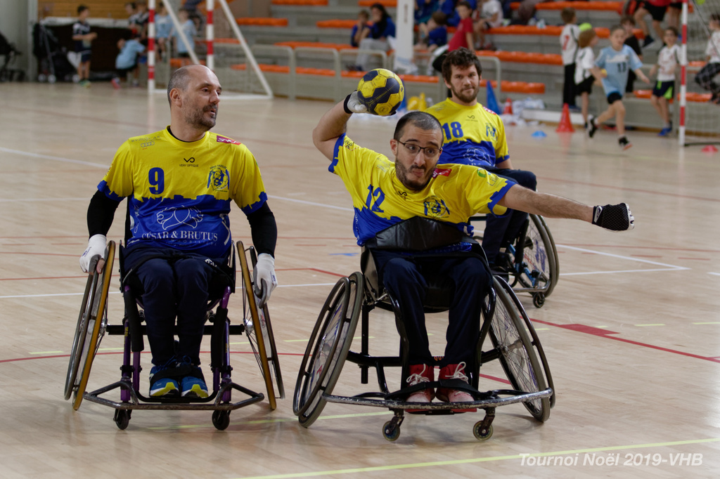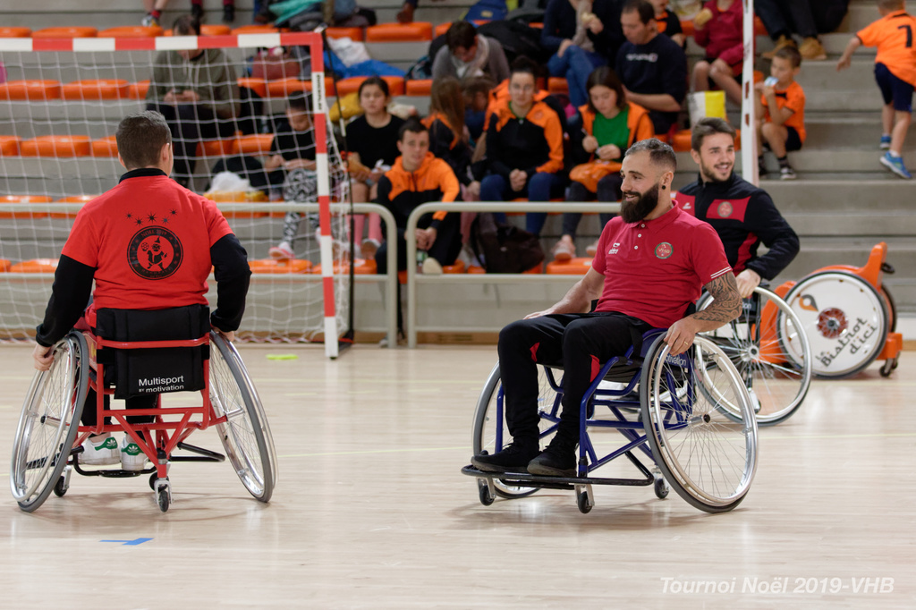 Démonstration de HandFauteuil lors du Tournoi de Noël 2019 qui a eu lieu à Arnas. Les joueuses de D2 du club de l'ASUL Vaulx-en-Velin ainsi que les joueurs de N2 du club de Villefranche-sur-Saône se sont confrontés à la section HandFauteuil du club de Caluire.