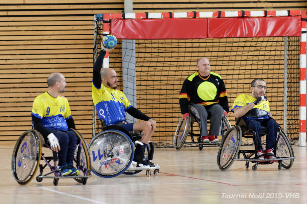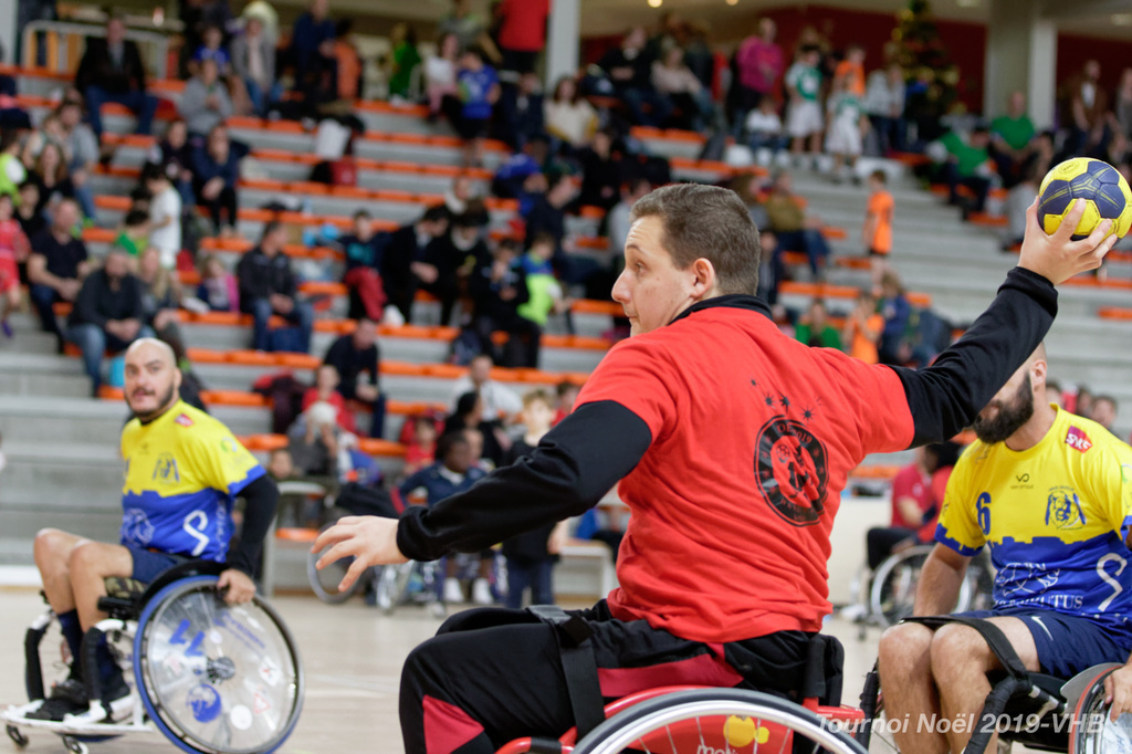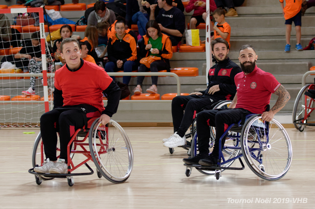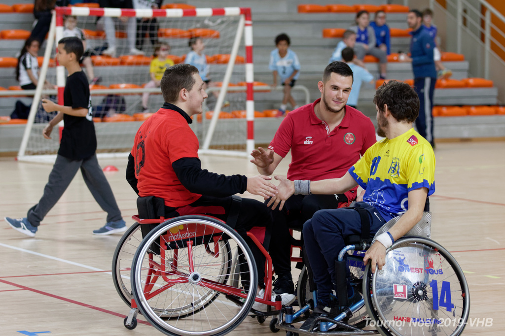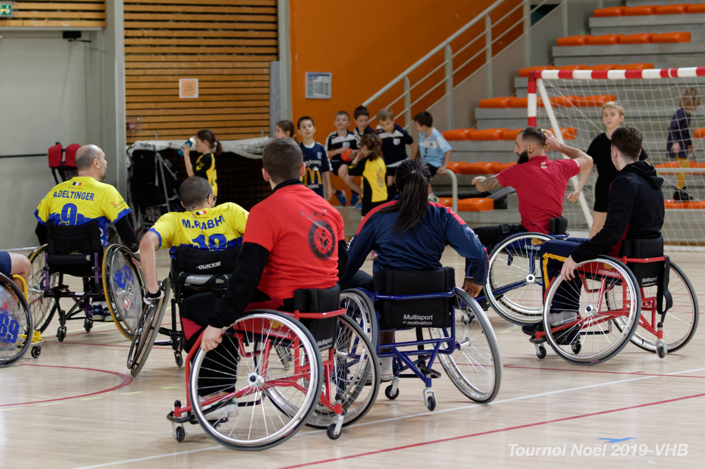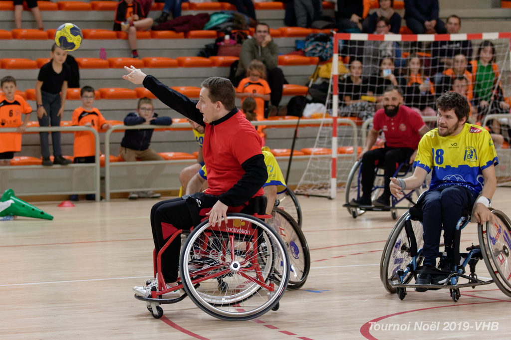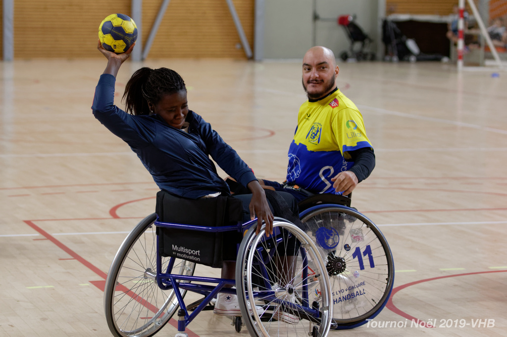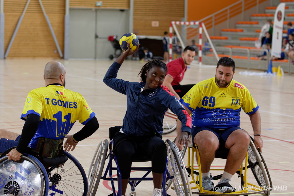 Démonstration de HandFauteuil lors du Tournoi de Noël 2019 qui a eu lieu à Arnas. Les joueuses de D2 du club de l'ASUL Vaulx-en-Velin ainsi que les joueurs de N2 du club de Villefranche-sur-Saône se sont confrontés à la section HandFauteuil du club de Caluire.
