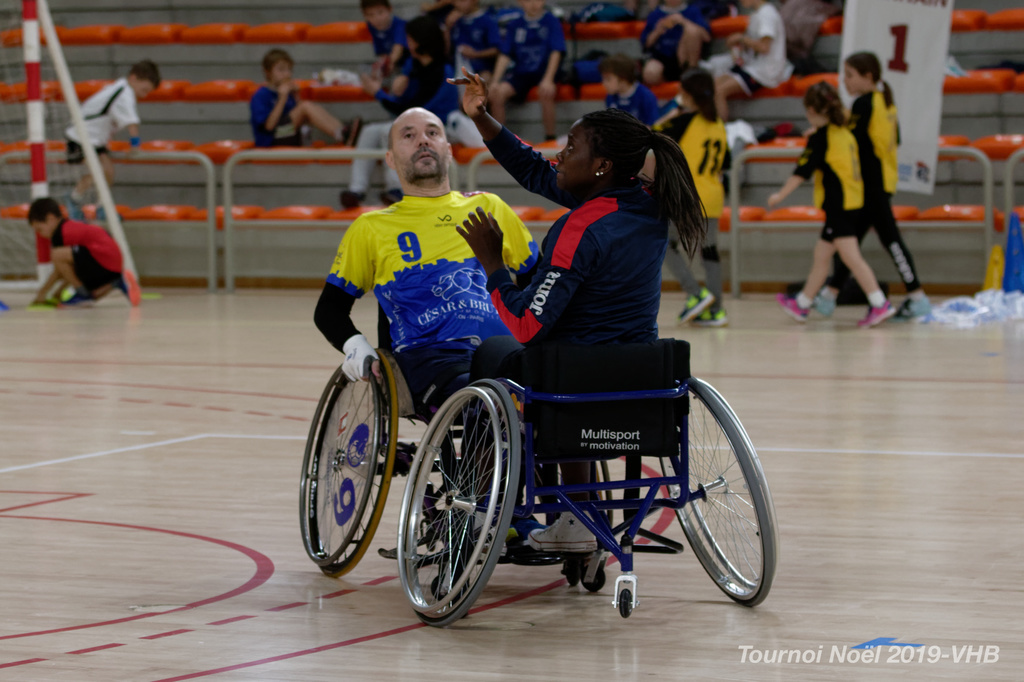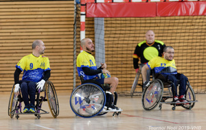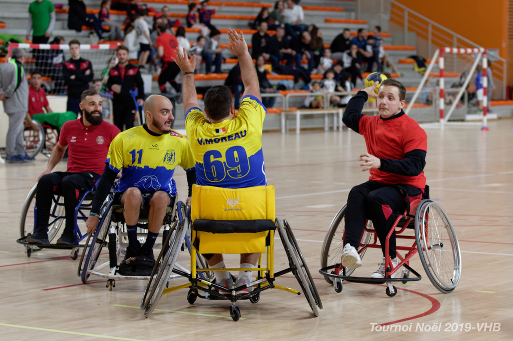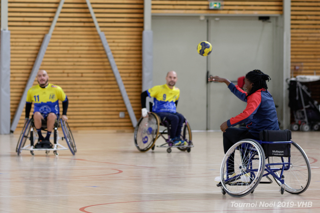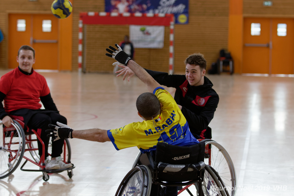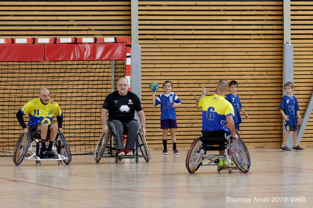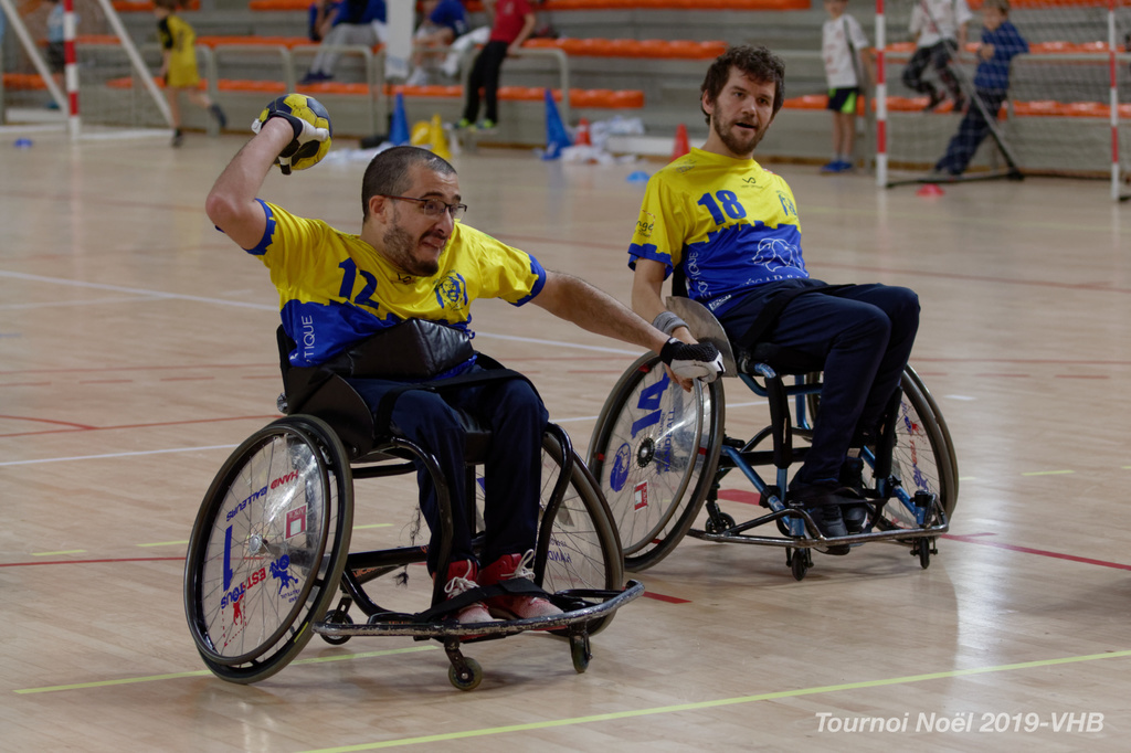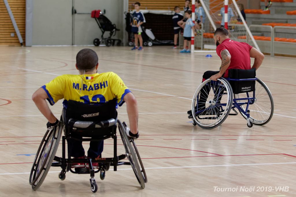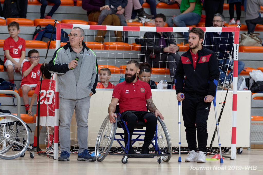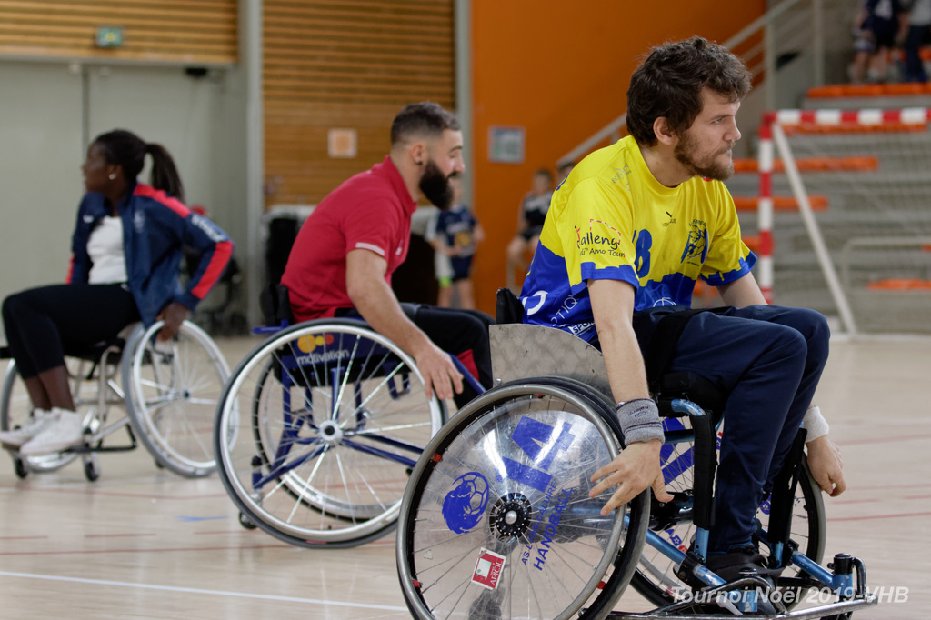 Démonstration de HandFauteuil lors du Tournoi de Noël 2019 qui a eu lieu à Arnas. Les joueuses de D2 du club de l'ASUL Vaulx-en-Velin ainsi que les joueurs de N2 du club de Villefranche-sur-Saône se sont confrontés à la section HandFauteuil du club de Caluire.