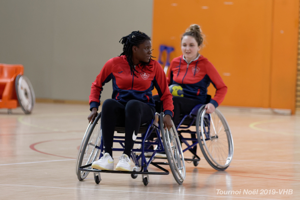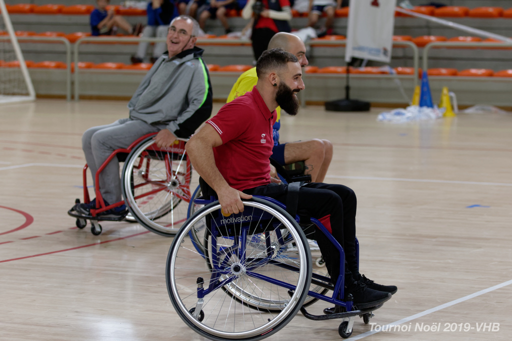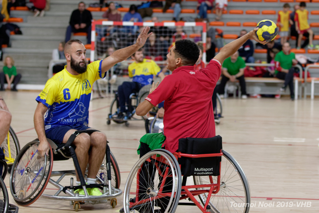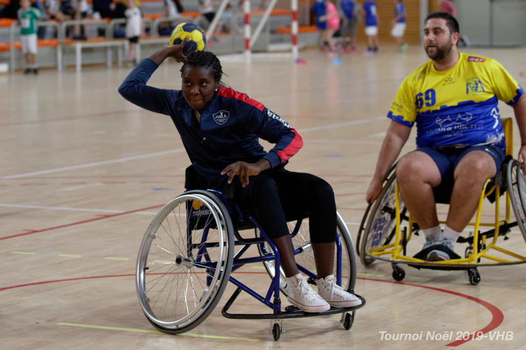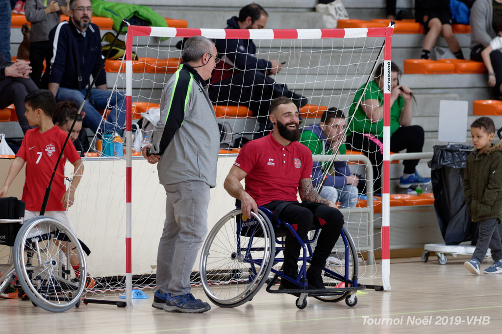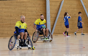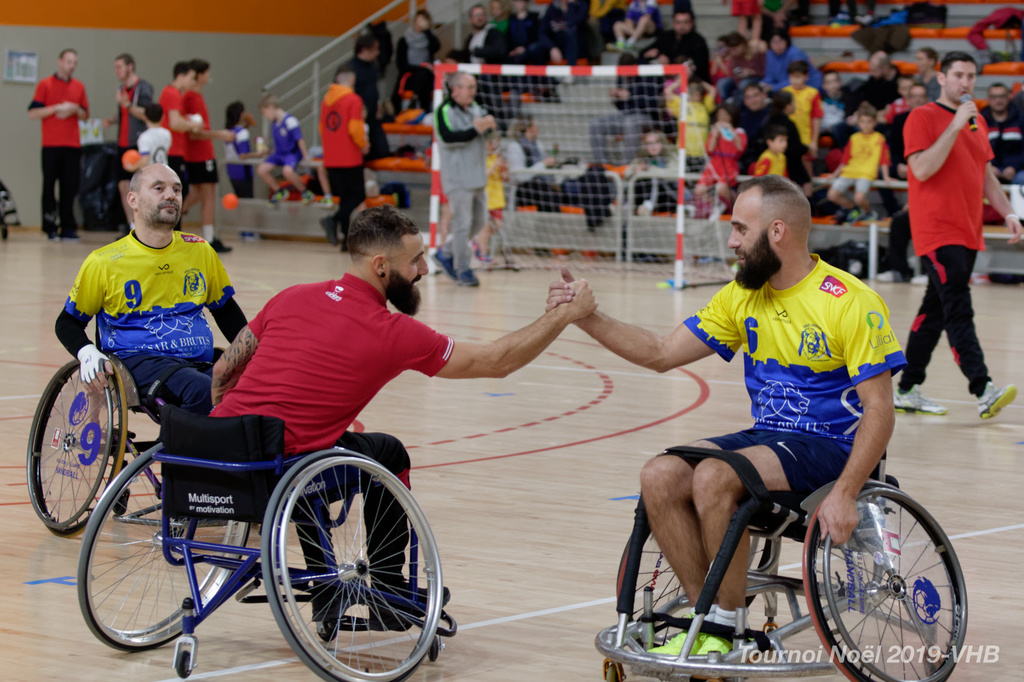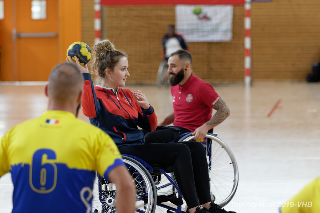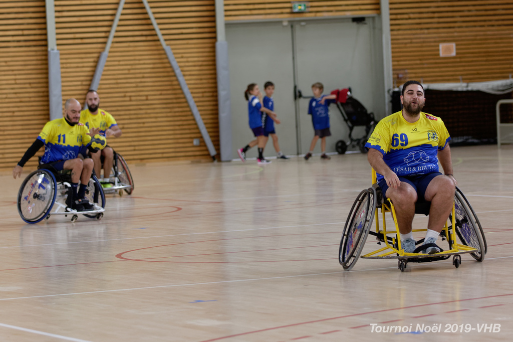 Démonstration de HandFauteuil lors du Tournoi de Noël 2019 qui a eu lieu à Arnas. Les joueuses de D2 du club de l'ASUL Vaulx-en-Velin ainsi que les joueurs de N2 du club de Villefranche-sur-Saône se sont confrontés à la section HandFauteuil du club de Caluire.