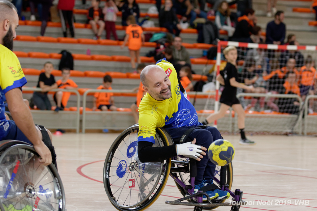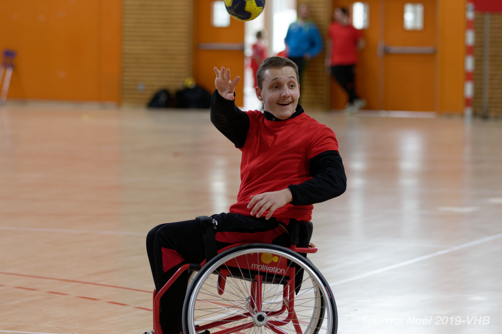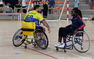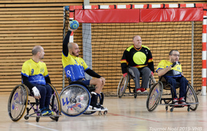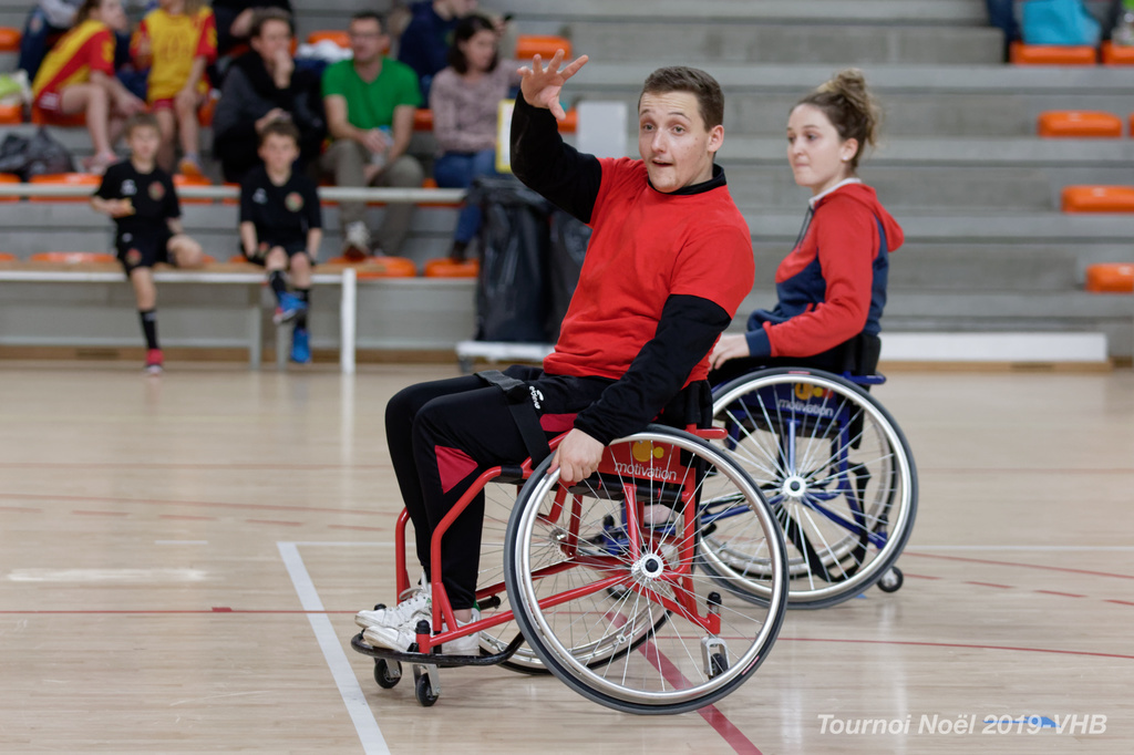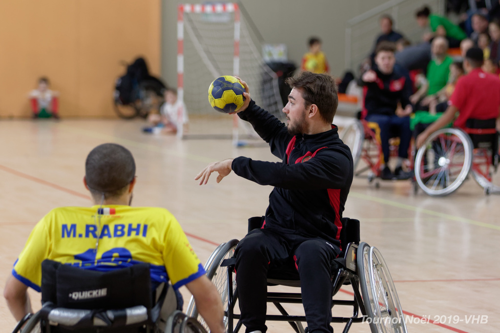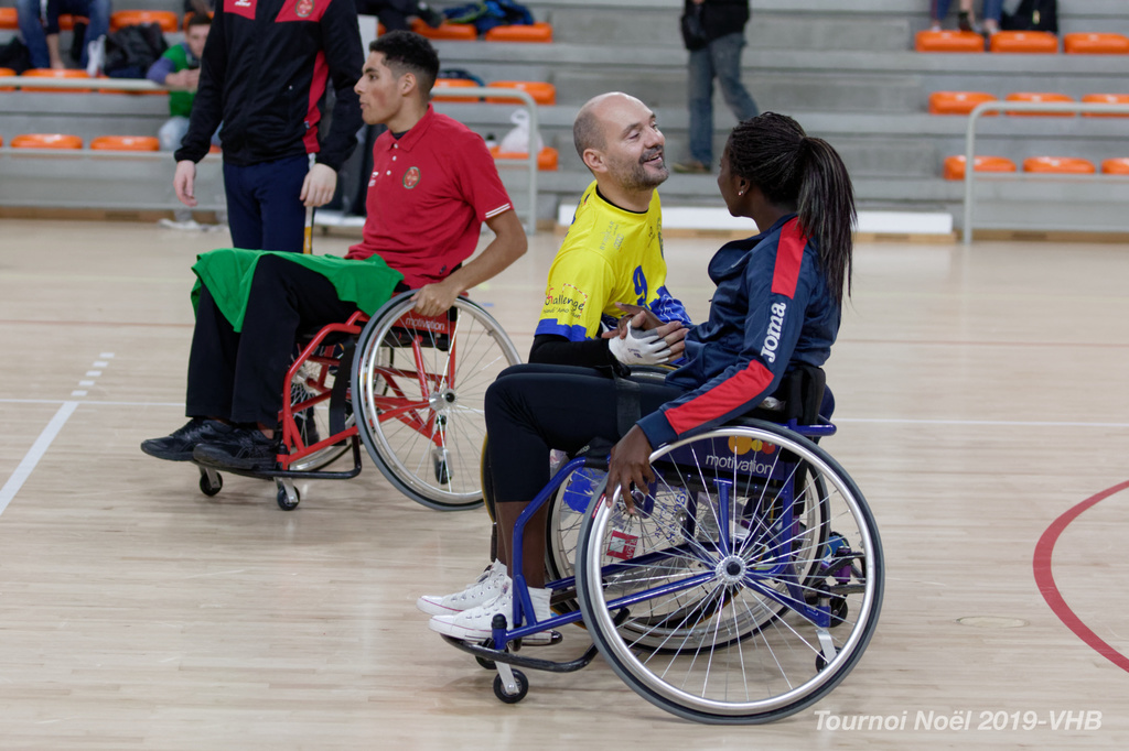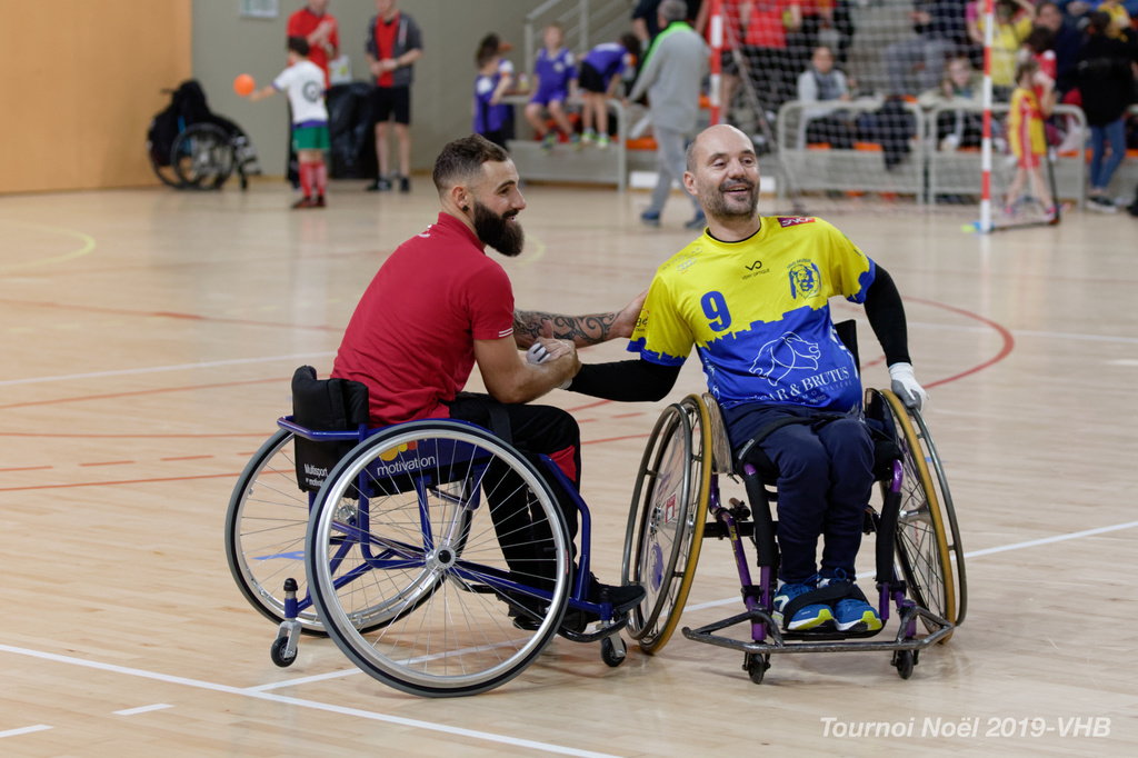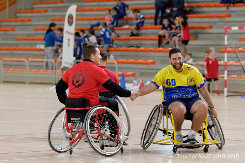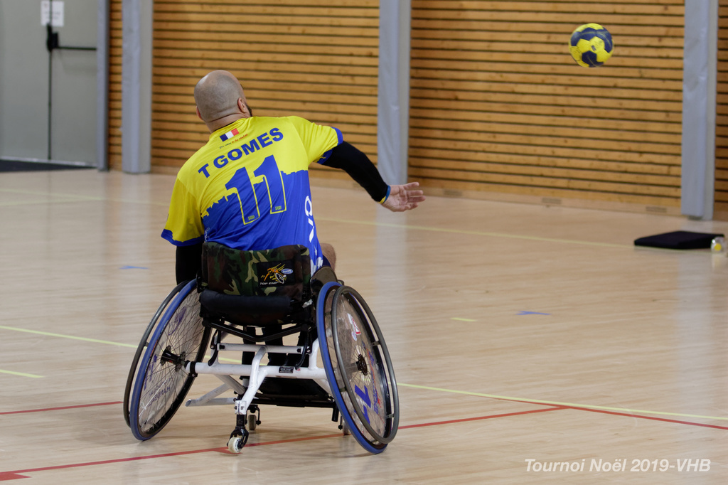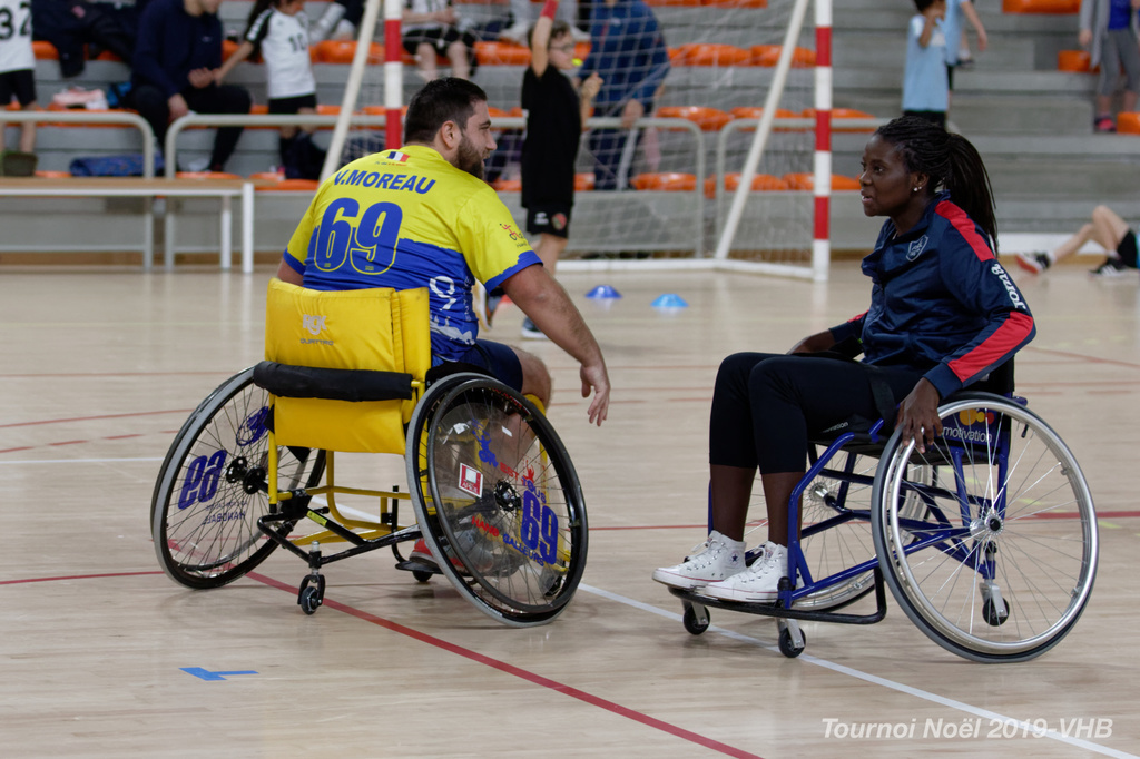 Démonstration de HandFauteuil lors du Tournoi de Noël 2019 qui a eu lieu à Arnas. Les joueuses de D2 du club de l'ASUL Vaulx-en-Velin ainsi que les joueurs de N2 du club de Villefranche-sur-Saône se sont confrontés à la section HandFauteuil du club de Caluire.