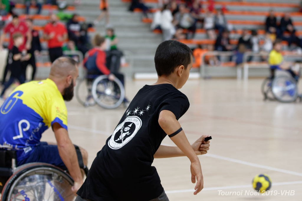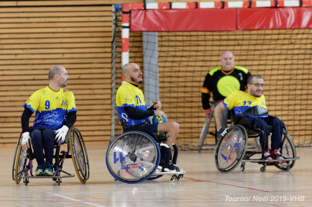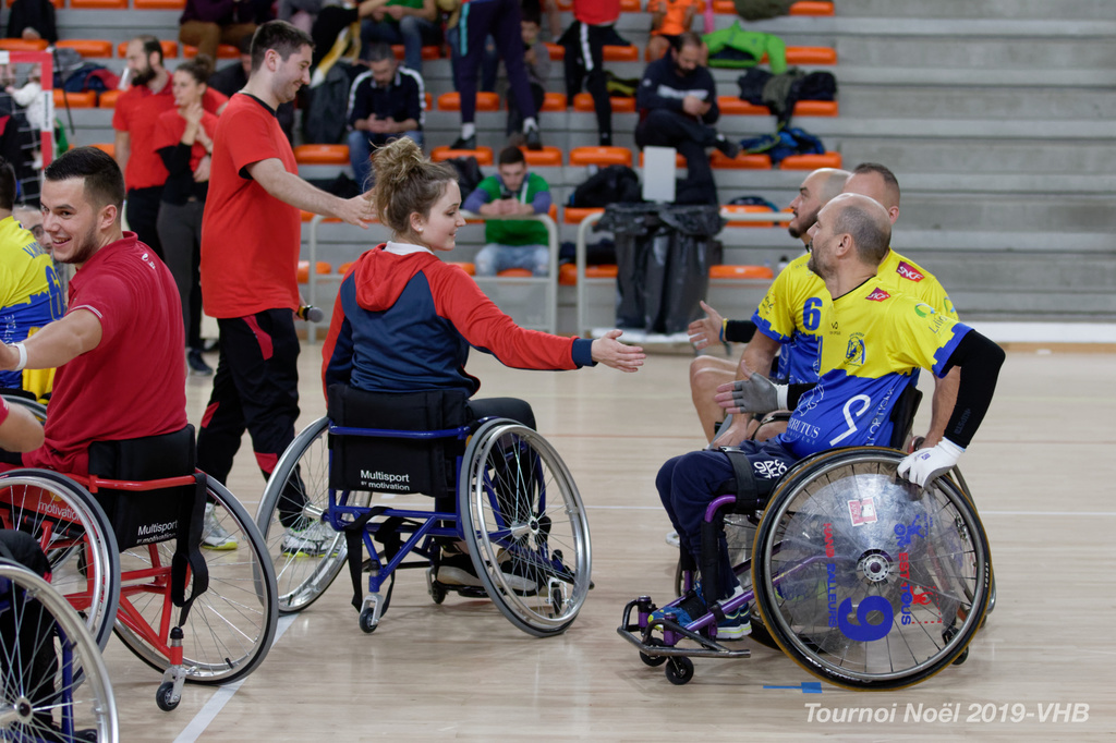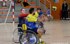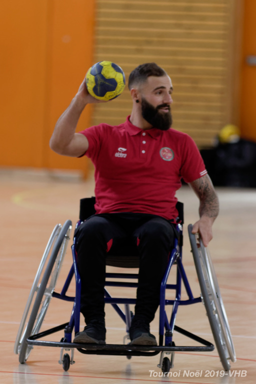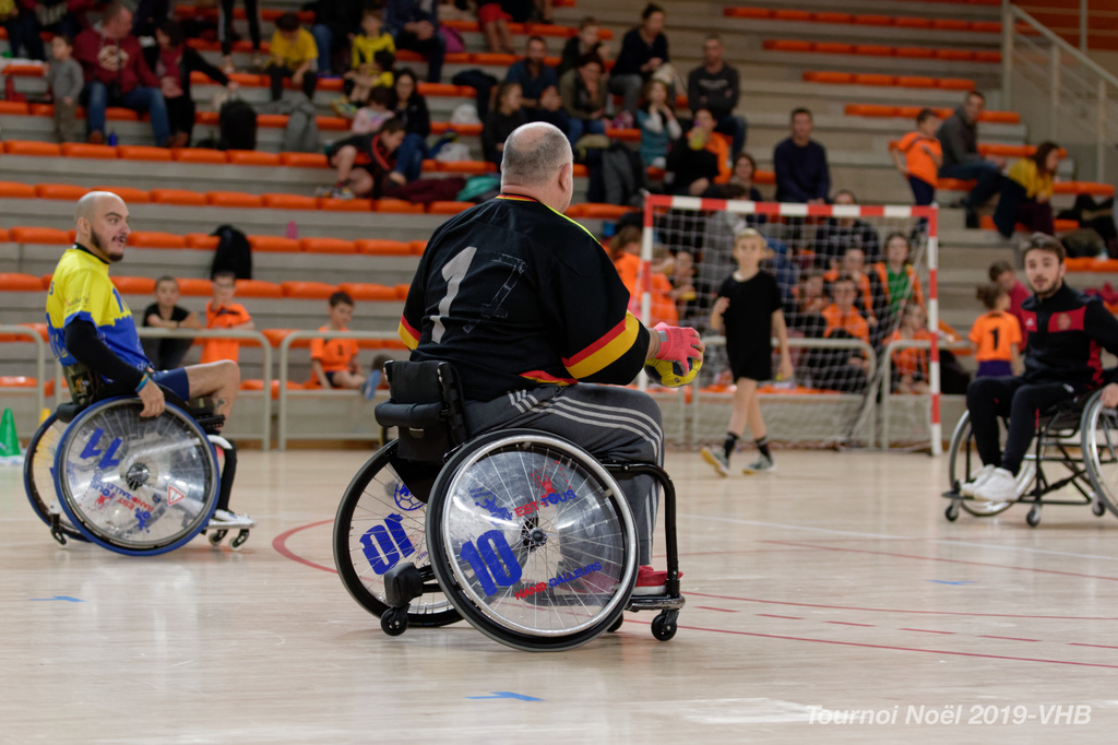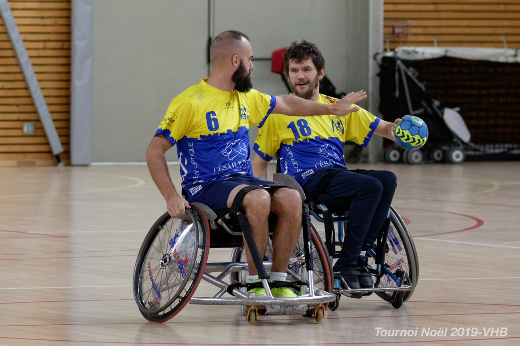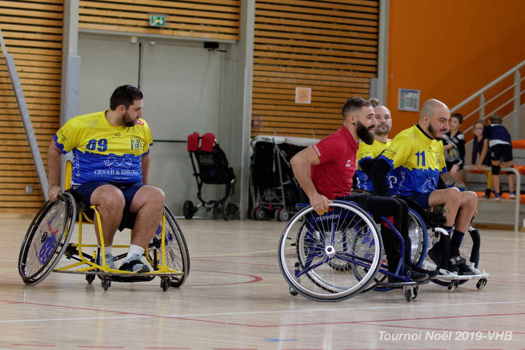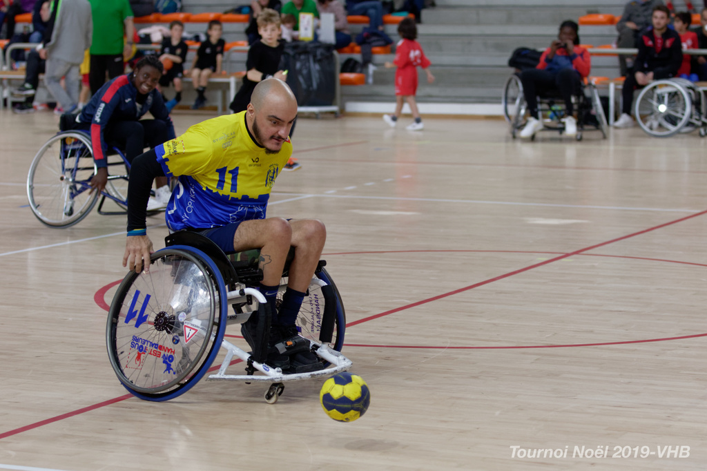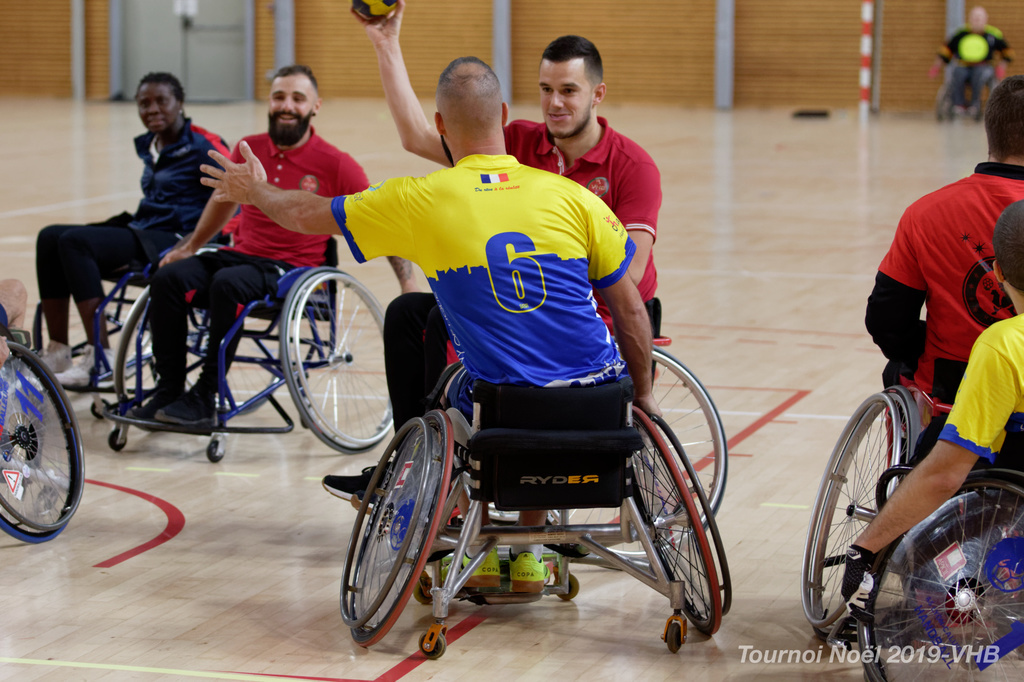 Démonstration de HandFauteuil lors du Tournoi de Noël 2019 qui a eu lieu à Arnas. Les joueuses de D2 du club de l'ASUL Vaulx-en-Velin ainsi que les joueurs de N2 du club de Villefranche-sur-Saône se sont confrontés à la section HandFauteuil du club de Caluire.