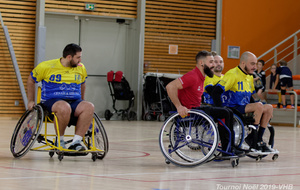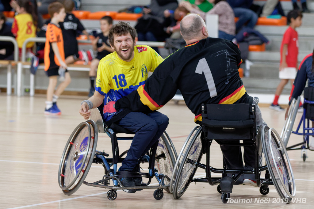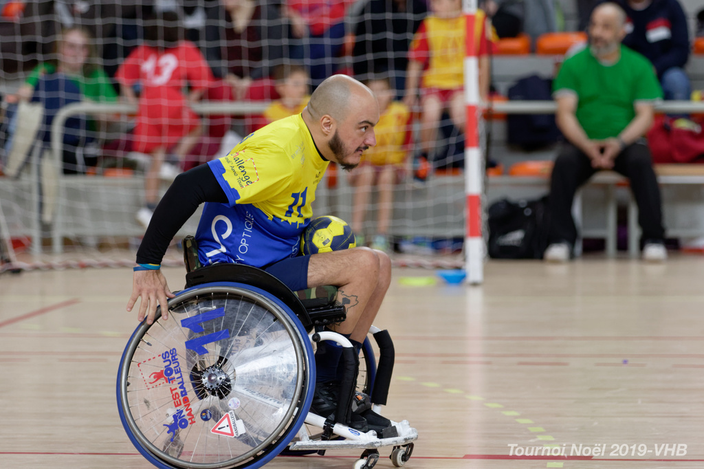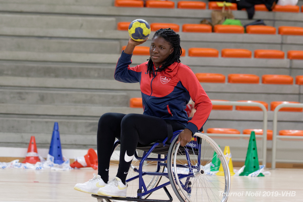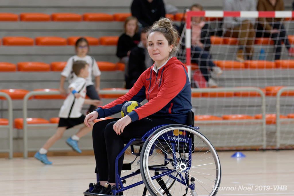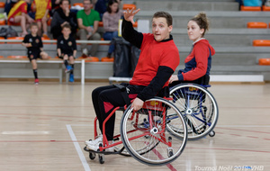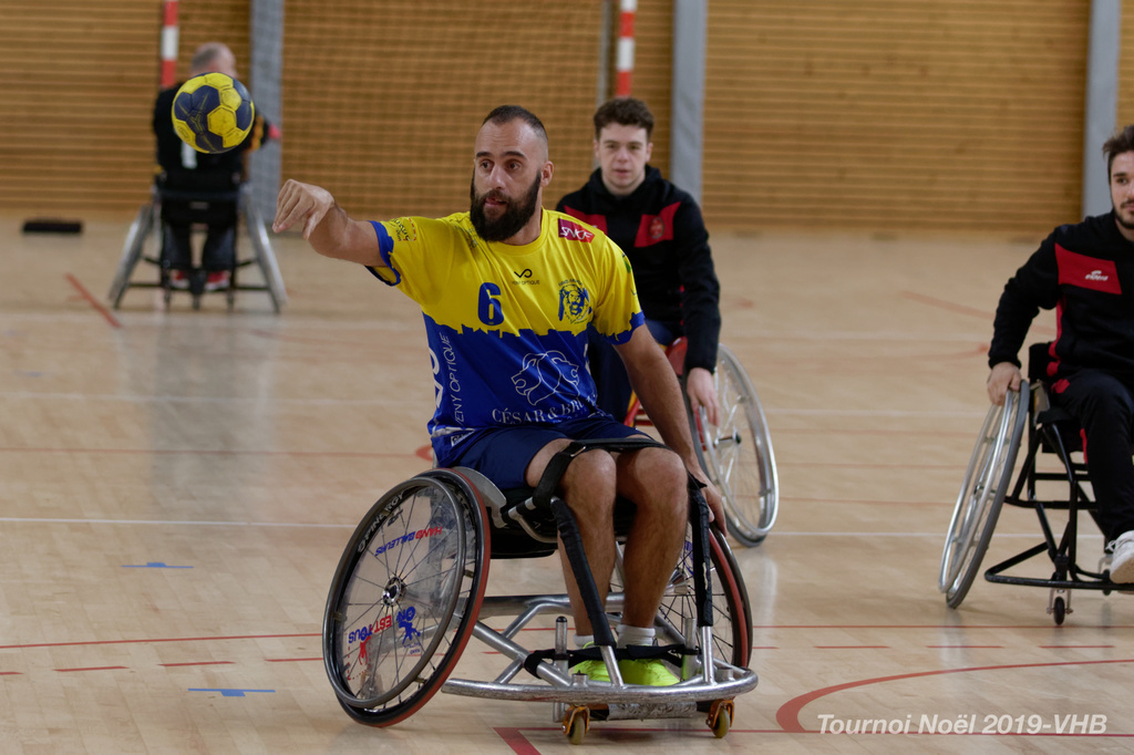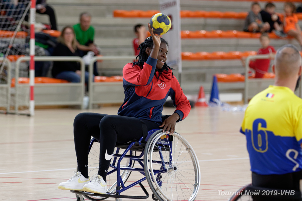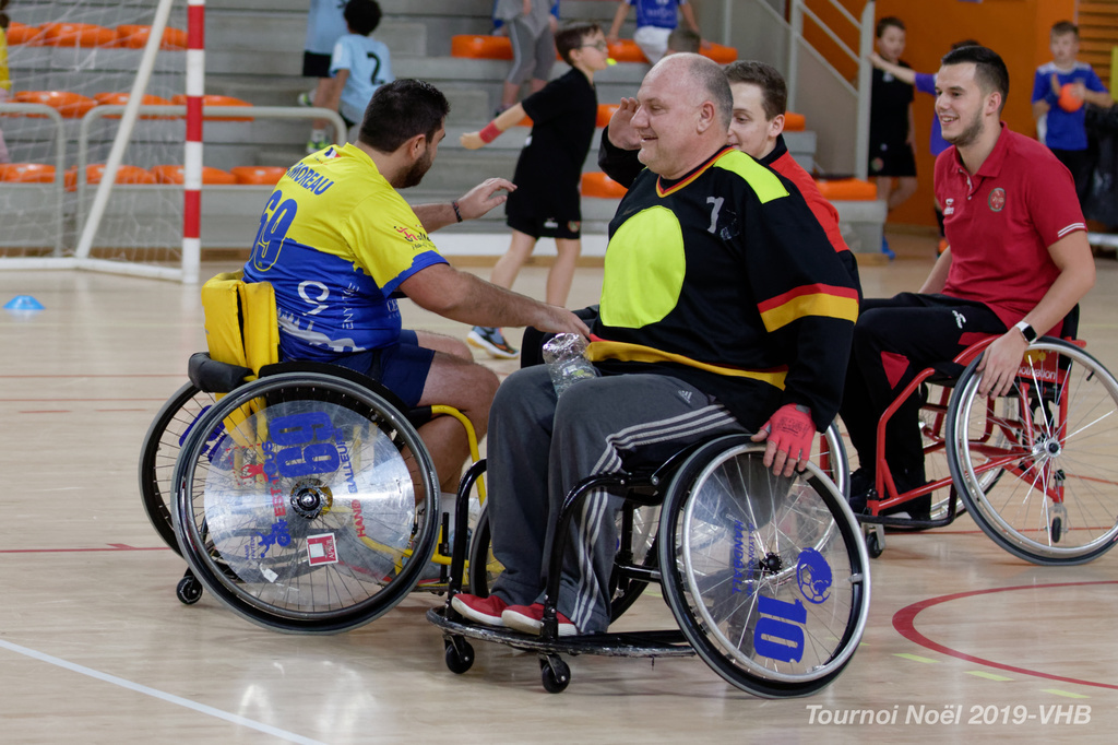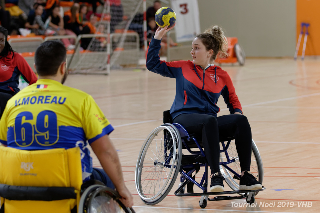 Démonstration de HandFauteuil lors du Tournoi de Noël 2019 qui a eu lieu à Arnas. Les joueuses de D2 du club de l'ASUL Vaulx-en-Velin ainsi que les joueurs de N2 du club de Villefranche-sur-Saône se sont confrontés à la section HandFauteuil du club de Caluire.