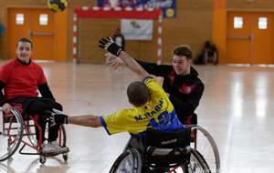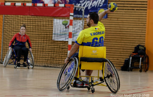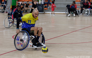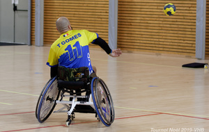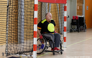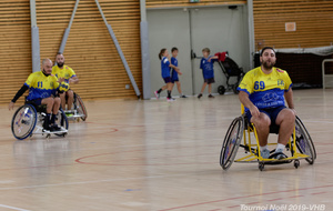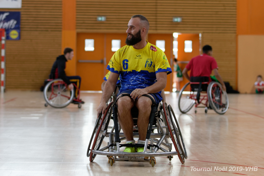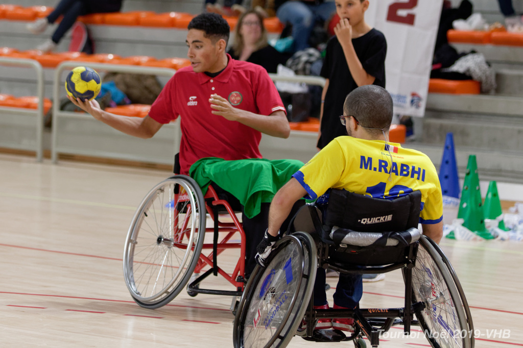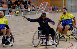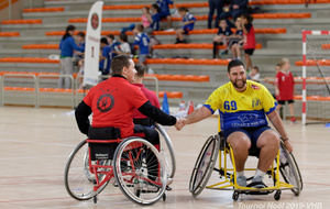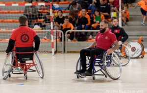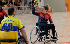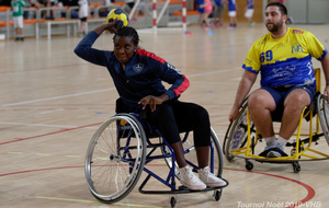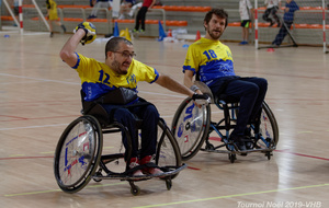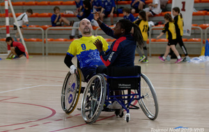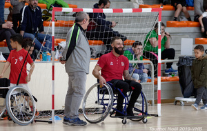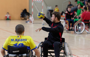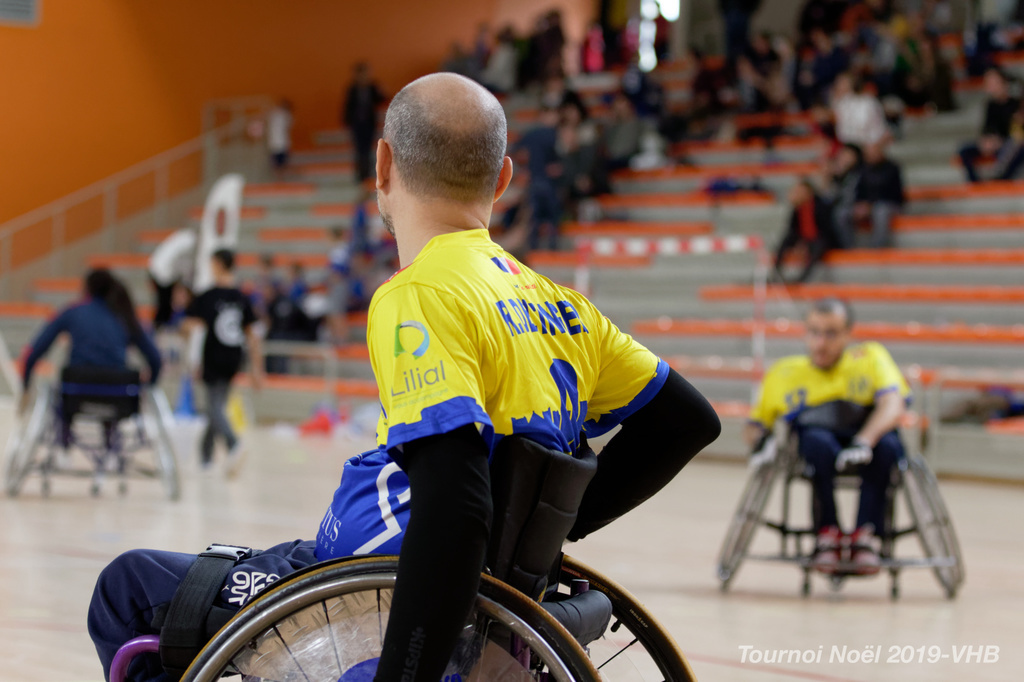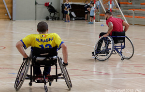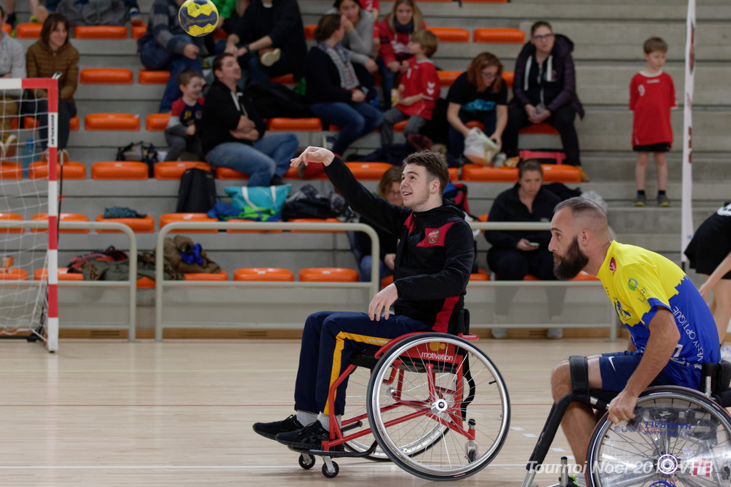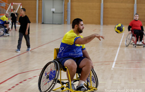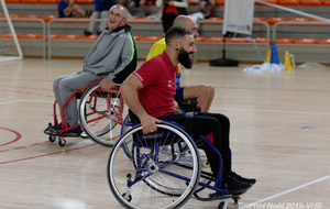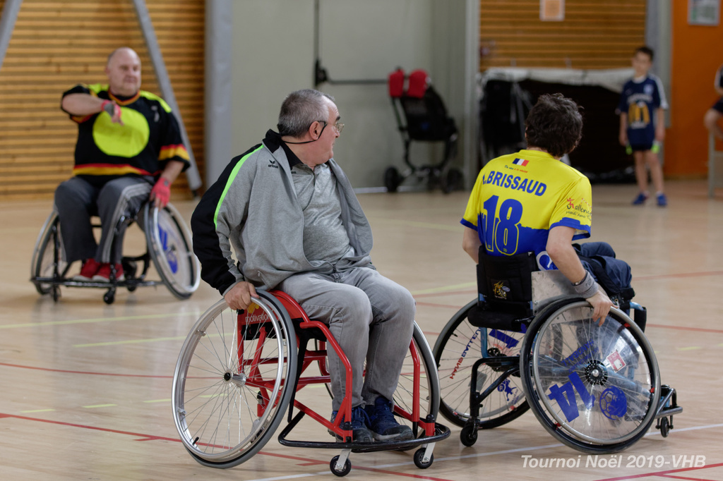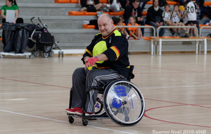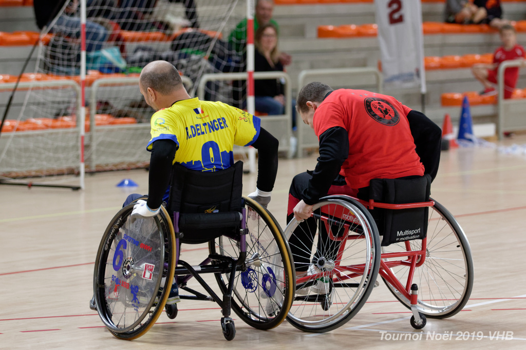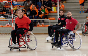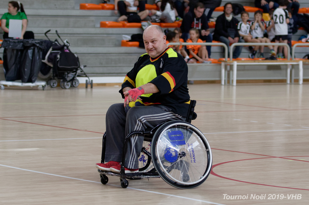Démonstration de HandFauteuil lors du Tournoi de Noël 2019 qui a eu lieu à Arnas. Les joueuses de D2 du club de l'ASUL Vaulx-en-Velin ainsi que les joueurs de N2 du club de Villefranche-sur-Saône se sont confrontés à la section HandFauteuil du club de Caluire.